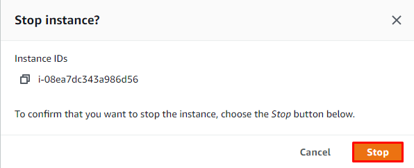 | 26. Klik "Stop" untuk mengkonfirmasi tindakan menonaktifkan Instance. |
